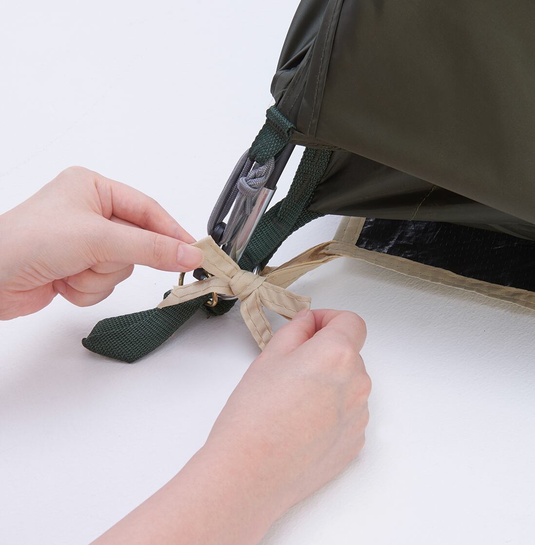 インナーテントが吊り下げ式の場合、インナーテント四隅のループに結んでください。