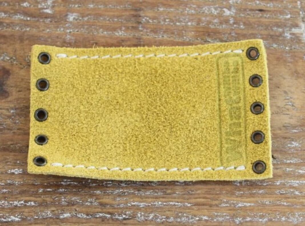 付属の革ひもは長めなので結び目をフックなどに引っ掛けられるようにしています。