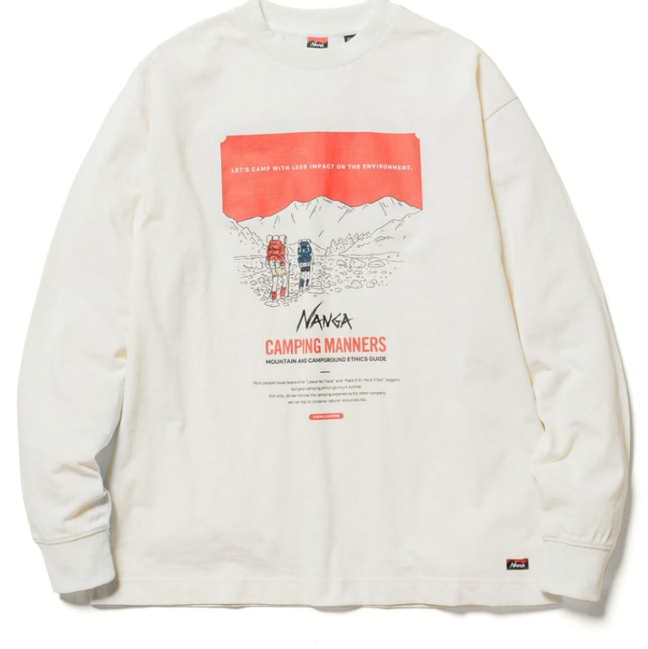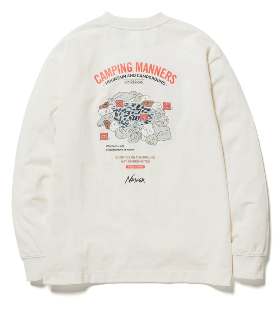 キャンプ場でのマナーを啓蒙するグラフィックをプリントしたロングスリーブTシャツ。アウトドア好きにはたまらないデザインに。環境に配慮しながら、アウトドアを楽しもうといったメッセージが込められています。