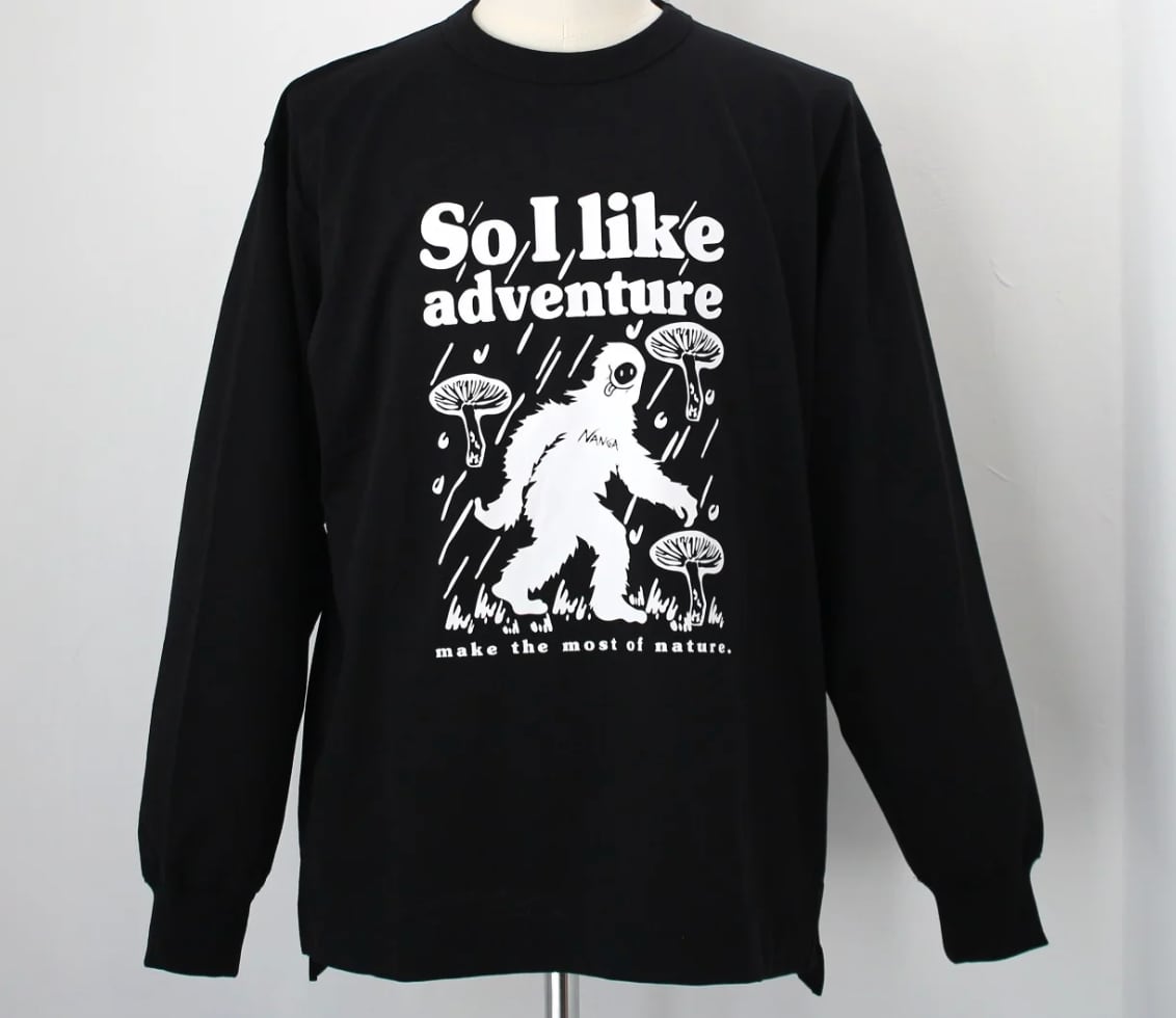 「So I like adventure」のメッセージと、雨やキノコのモチーフが、未知の自然での発見や挑戦を象徴しています。NANGAのダウンマンをモチーフにしたデザインは、冒険心とアウトドアスピリットをユーモアたっぷりに表現。太めのフォントとノスタルジックなタッチのイラストが、ヴィンテージポスターのような温かみを演出します。