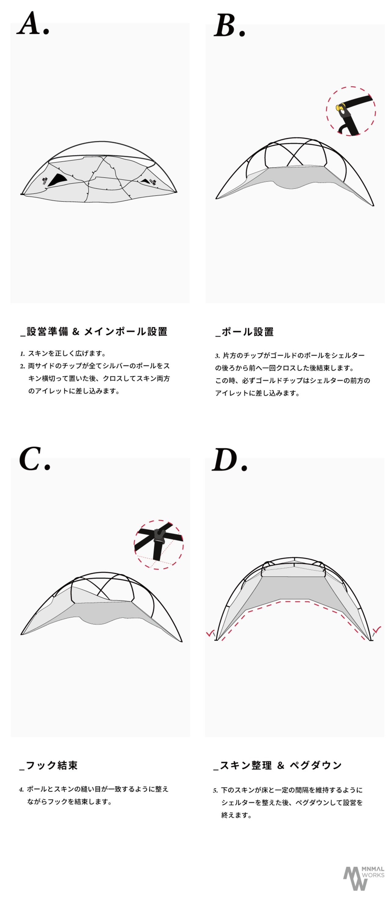 2つのポール(2本連結式)で構成されたグラマーシェルターは初心者でも簡単&素早く組み立てが可能です。